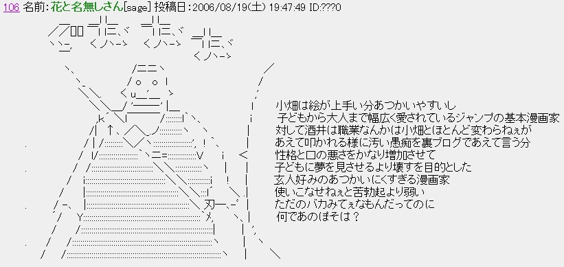 _ _l l_ _l l_ //[][]  ̄l lニ、ヾ  ̄l lニ、ヾ _l l_ ヽヽ-, く ノヽ-ゝ く ノヽ-ゝ  ̄l lニ、ヾ  ̄ く ノヽ-ゝ ヽ、 /ニニヽ / ヽ_ / o o l / \\. く u_'_ ゝ ,' \\_/ '――‐' |_ l 小畑は絵が上手い分あつかいやすいし ,k´ \l ̄ ̄ ̄/::::::::l`ヽ、 i 子どもから大人まで幅広く愛されているジャンプの基本漫画家 /| ↑、 /\_.ノ:::::::::::ヽ ヽ | 対して酒井は職業なんかは小畑とほとんど変わらねぇが . / | /:::::::::\/ヽ:::::::::::::::::::', ! `、 | あえて叩かれる様に汚い愚痴を裏ブログであえて言う分 / l/:::::::::::::::::::`ヽニ=::::::::::::::V i < 性格と口の悪さをかなり増加させて . / /::::::::::::::::::::::::::::::\\:::::::::::::ヽ | | 子どもに夢を見させるより壊すを目的とした / i:::::::::::::::::::::::::::::::::::::::\\:::::::::::i ! | 玄人好みのあつかいにくすぎる漫画家 / |:::::::::::::::::::::::::::::::::::::::::::::\\:::l´ \ .| 使いこなせねぇと苦勃起より弱い . / -、 |::::::::::::::::::::::::::::::::::::::::::::::::::\ 刃―、-゙ | ただのバカみてぇなもんだってのに ´/ Y:::::::::::::::::::::::::::::::::::::::::::::::::::::::::`メ, ヽ、| 何であのぽそは? / /::::::::::::::::::::::::::::::::::::::::::::::::::::::::::::::::| | ', . / /::::::::::::::::::::::::::::::::::::::::::::::::::::::::::::::::::::ヽ | ヽ / /:::::::::::::::::::::::::::::::::::::::::::::::::::::::::::::::::::::::::::ヽ | \ 元ネタ:斬 / 杉田尚 http://2chz.web.fc2.com/zan.html |
